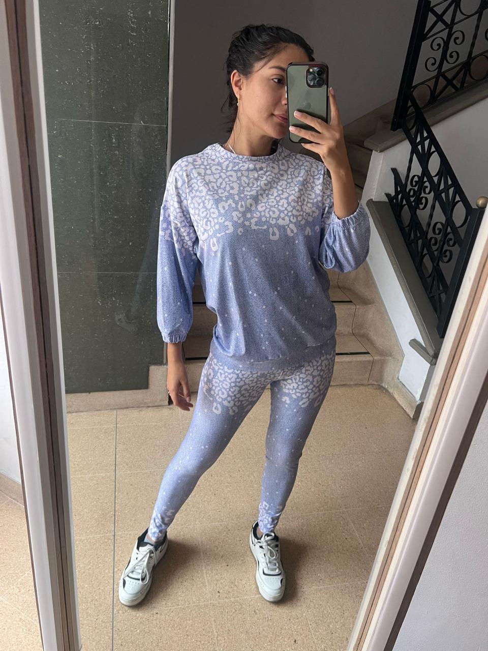 Este conjunto es la combinación perfecta entre lo cozy y lo trendy. Ideal para tus días de descanso, tus paseos casuales o para llevar comodidad y estilo en cada movimiento. Su estampado tipo animal print en tonos celestes le da un aire delicado pero con personalidad.