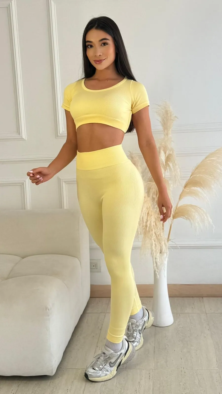 Conjunto deportivo femenino en tono amarillo pastel, diseñado para brindar comodidad y estilo incluye: