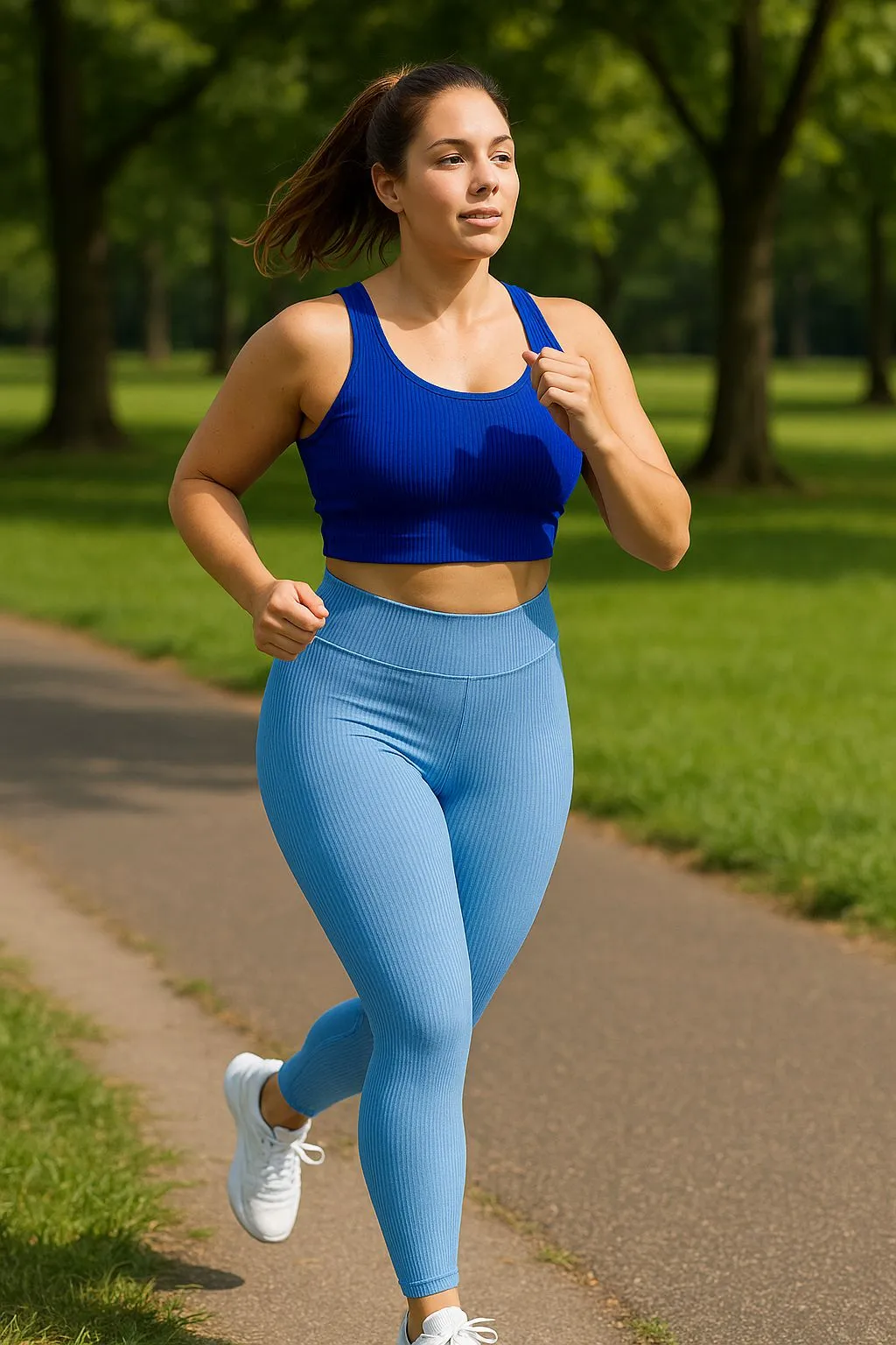 • Legging de tiro alto en azul celeste con textura acanalada se ajusta perfectamente a la silueta, brindando libertad de movimiento y un look moderno.